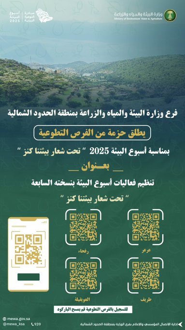 يعلن فرع وزارة البيئة والمياه والزراعة بمنطقة الحدود الشمالية، ممثلاً بإدارة منظمات القطاع غير الربحي، عن إطلاق حزمة من الفرص التطوعية بالتزامن مع انطلاق فعاليات أسبوع البيئة 2025، تحت شعار "بيئتنا كنز".