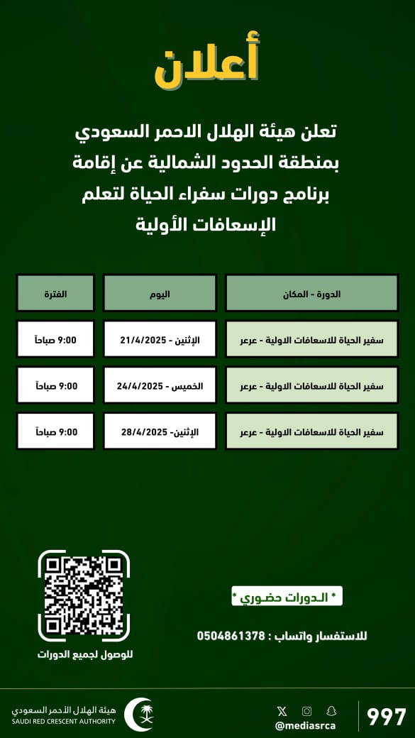 يعلن فرع هيئة الهلال الأحمر السعودي بمنطقة الحدود الشمالية عن إقامة برنامج "سفراء الحياة للإسعافات الأولية"، وذلك في مركز التدريب والتثقيف المجتمعي بمدينة عرعر.