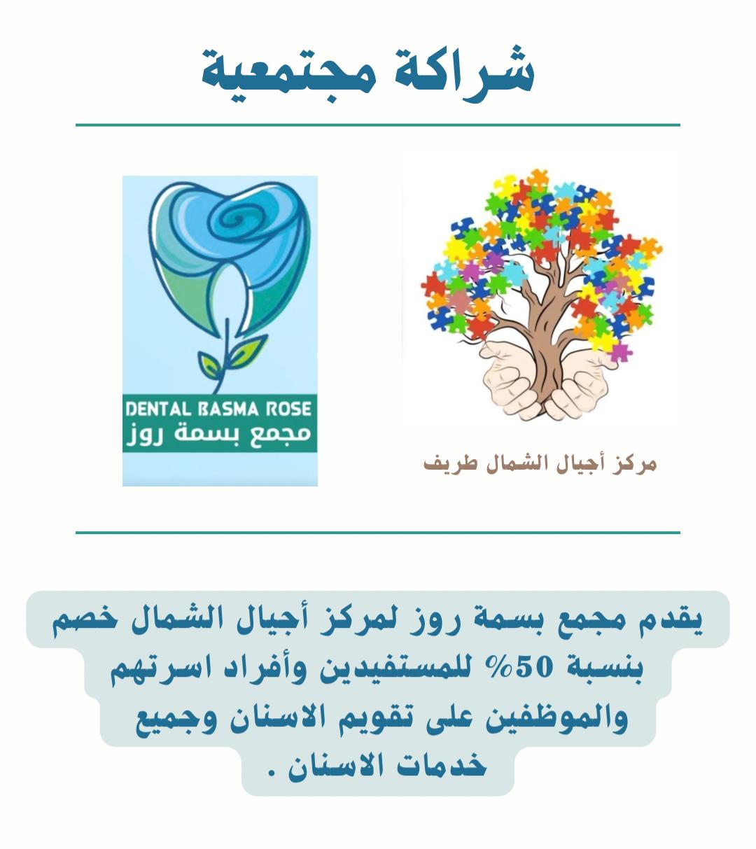 تم توقيع مذكرة شراكة مجتمعية لخدمة ذوي الإحتياجات الخاصة بين مجمع بسمة روز لطب الأسنان ومركز أجيال الشمال لرعاية النهارية بمحافظة طريف .وذلك انطلاقاً من مبدأ التعاون وتحقيق هدف الشراكات المجتمعية