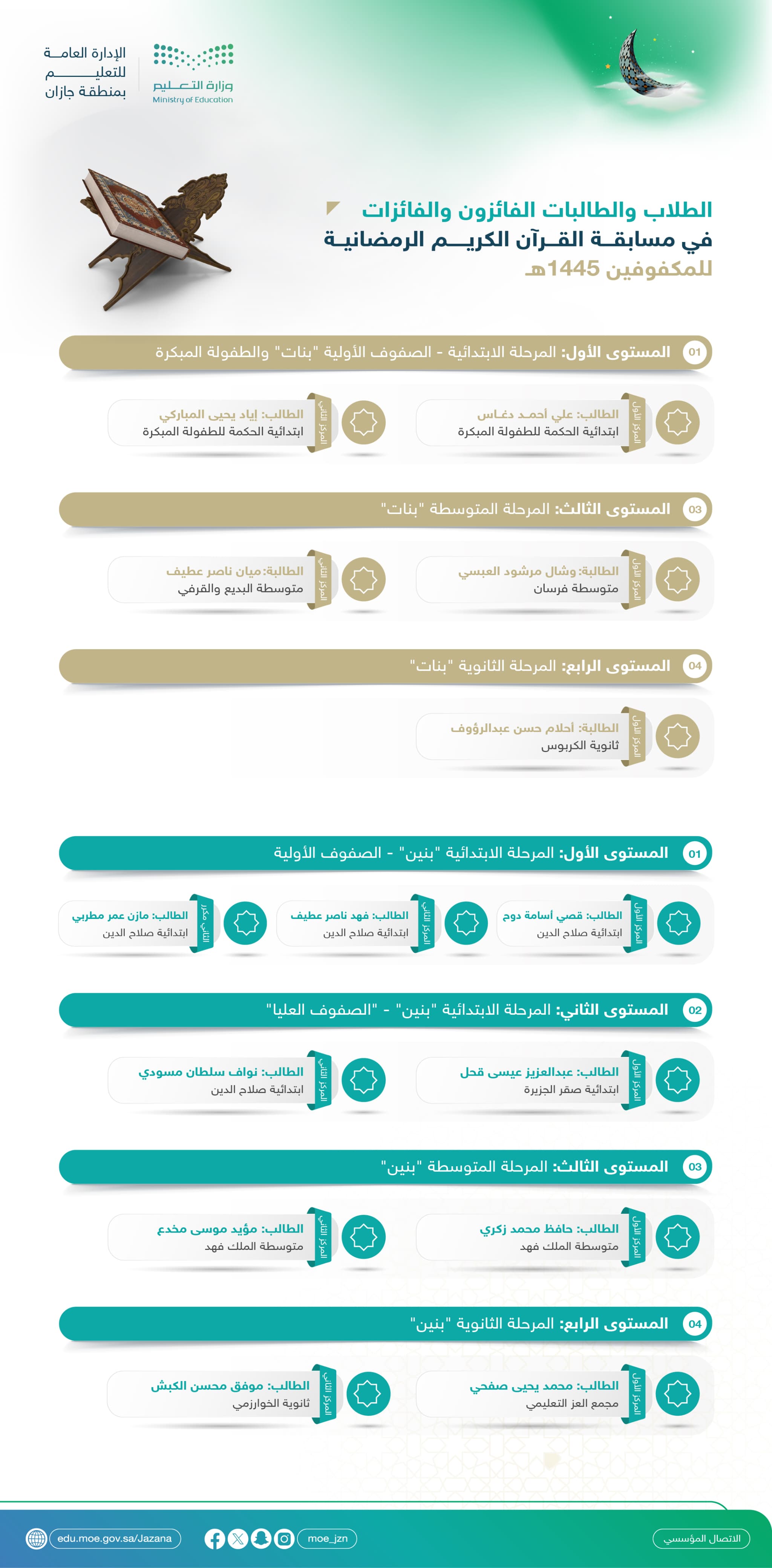 اعلنت الإدارة العامة للتعليم بمنطقة جازان أسماء الفائزين والفائزات في مسابقة القرآن الكريم الرمضانية للمكفوفين للعام 1445هـ الموسم الثالث والتي نظمتها إدارة تنمية القدرات قسم ذوي الإعاقة وبالتعاون مع إدارة أداء التعليم قسم النشاط الطلابي
