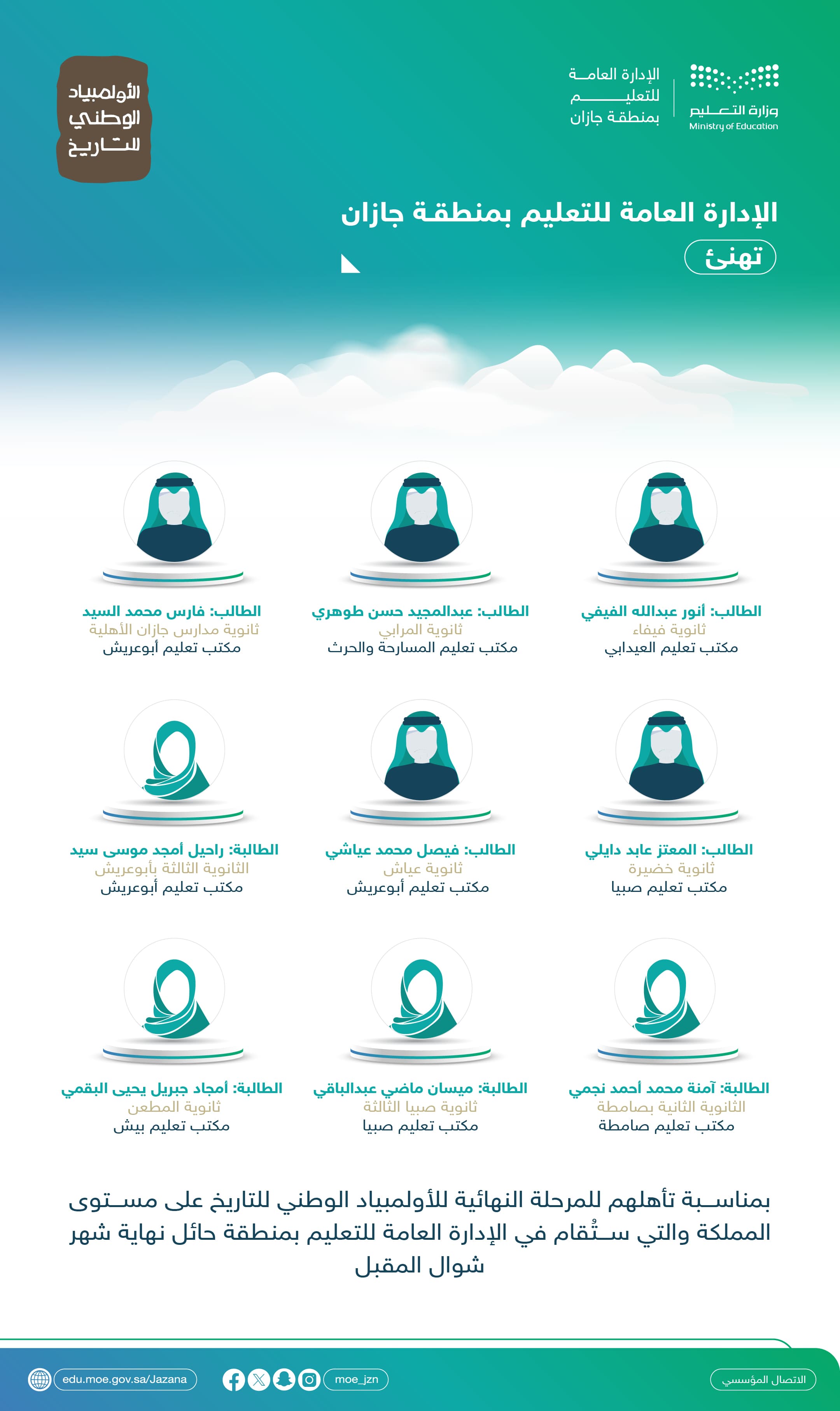 وتأهل كل من الطلاب أنور الفيفي وعبدالمجيد طوهري وفارس السيد والمعتز دايلي وفيصل عياشي ، والطالبات راحيل سيد وآمنة نجمي وميسان عبدالباقي وأمجاد البقمي من الأولمبياد الذي يهدف لغرس المبادئ والقيم الوطنية لدى الطلبة، وتعزيز الانتماء الوطني، وتعريفهم بتاريخ المملكة، إضافة إلى المساهمة في المحافظة على إرثها الثقافي والحضاري، وكذلك الاطلاع على تاريخ العالم.