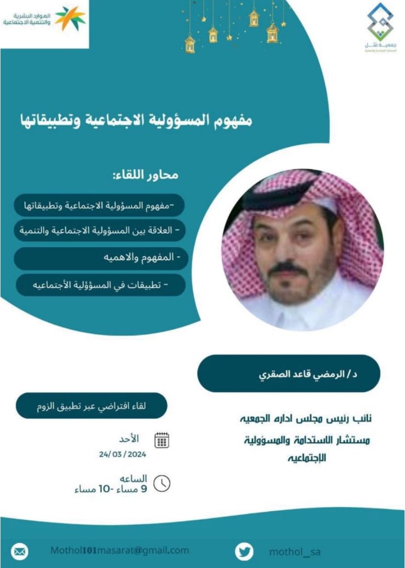 نظمت إدارة دار الحضانة الاجتماعية بالربوه بالشراكة مع جمعية مُثل للمسارات الإرشادية والمهنية مساء الأحد 24 / 3محاضرة عبر الzoom عن ( مفهوم المسؤوليةالاجتماعية وتطبيقاتها ) وذلك بمناسبة يوم المسؤولية الاجتماعية ،قدمها الدكتور:الرمضي قاعد الصقري نائب رئيس مجلس إداره الجمعية ومستشار الإستدامة
