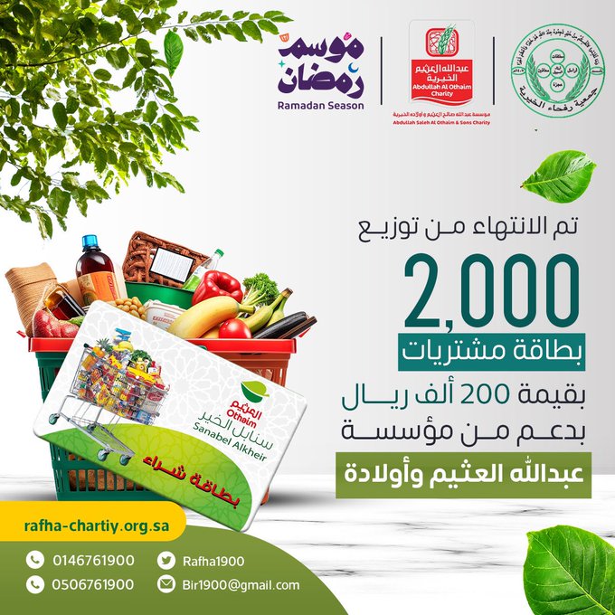 ضمن مبادرة صاحب السمو الملكي الامير فيصل بن خالد بن سلطان بن عبدالعزيز ، امير منطقة الحدود الشمالية "في شهر الخير ابشر بالخير4"، وبدعم سخي من مؤسسة عبدالله العثيم وأولاده الخيرية انتهت جمعية رفحاء الخيرية من توزيع بطائق المشتريات لمستفيديها .