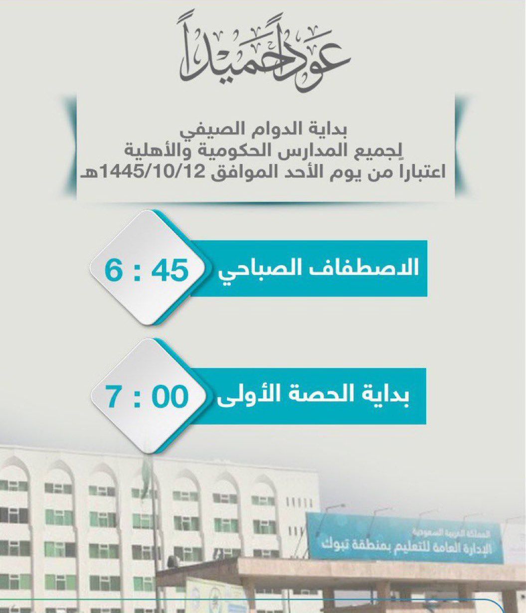 اعتمدت الإدارة العامة للتعليم بمنطقة تبوك، مواعيد الدوام الصيفي في جميع مدارس المنطقة الحكومية والأهلية والقطاعات التعليمية التابعة لها بنين وبنات وذلك ابتداءً من يوم الأحد 1445/10/12هـ .