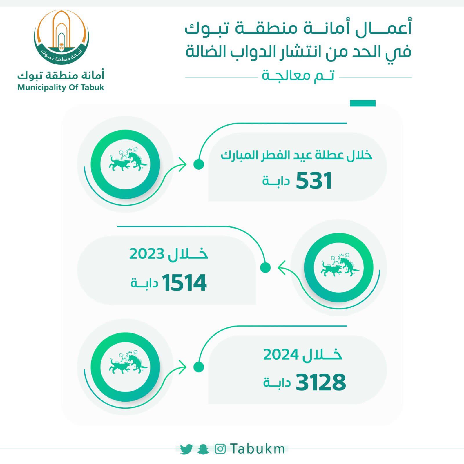 عالجت أمانة منطقة تبوك أوضاع ما يزيد عن 531 من الدواب الضالة، ضمن جهودها في الحد من انتشار الدواب في مختلف الأحياء.
