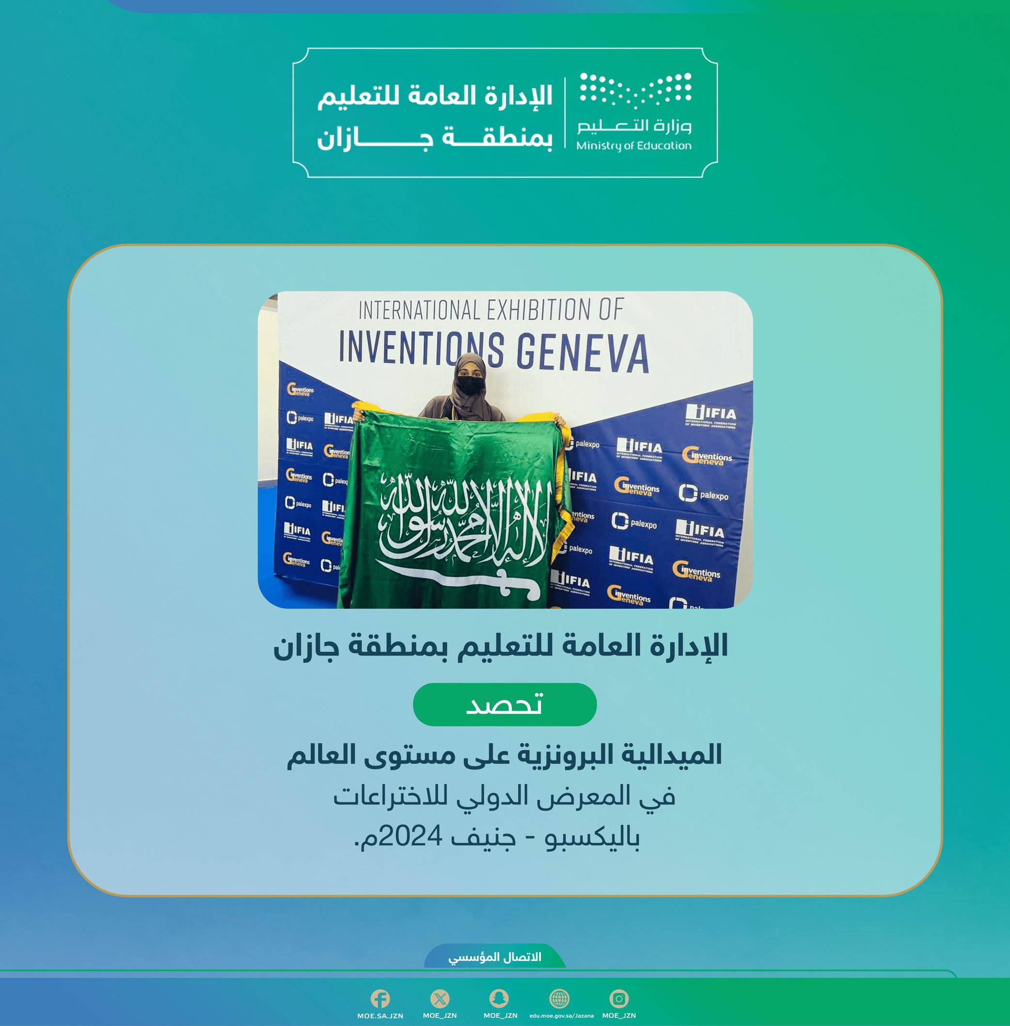 حصدت الإدارة العامة للتعليم بمنطقة جازان الميدالية البرونزية على مستوى العالم ، وذلك خلال مشاركة طلبة تعليم جازان ضمن الفريق السعودي الممثل للوطن في المعرض الدولي للاختراعات باليكسبو - جنيف 2024م.