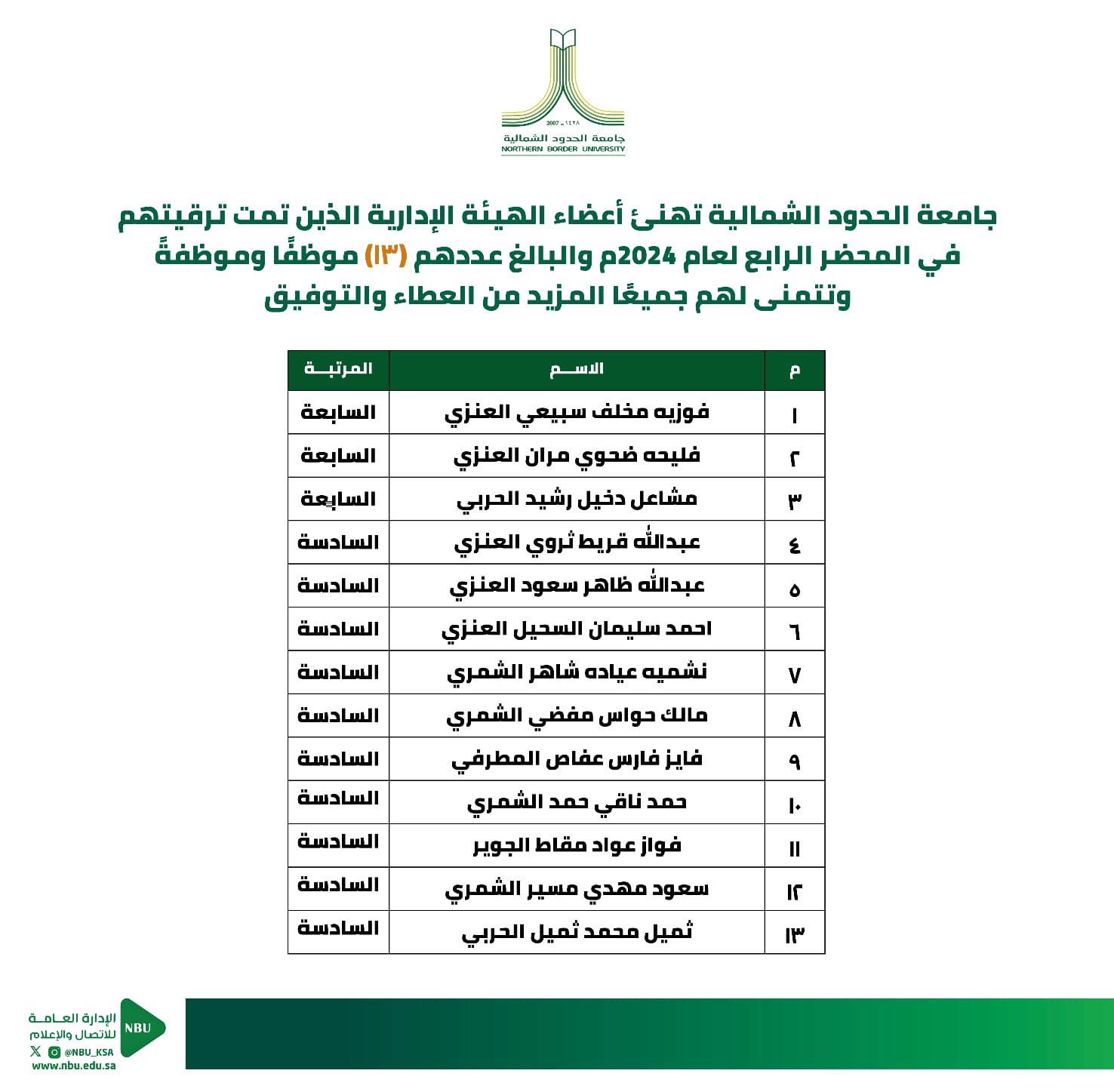 اعتمد سعادة رئيس جامعة الحدود الشمالية أ.د. أحمد بن علي الرميح محضر الترقيات الرابع للعام 2024 لعدد من موظفي وموظفات الجامعة الإداريين والإداريات من مستحقي الترقية.