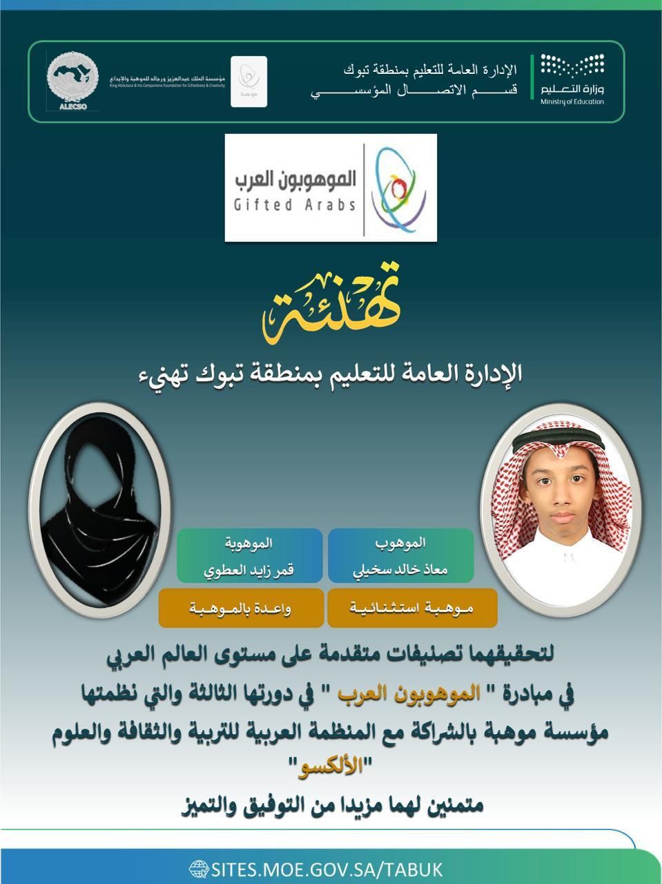 حققت الإدارة العامة للتعليم بمنطقة تبوك تصنيفات متقدمة على مستوى الوطن العربي في مبادرة "الموهوبون العرب" في دورتها الثالثة ، التي نظمتها مؤسسة الملك عبدالعزيز ورجاله للموهبة والإبداع "موهبة"؛ لاكتشاف ورعاية وتمكين المواهب العربية الشابة، بالشراكة مع المنظمة العربية للتربية والثقافة والعلوم (الألكسو).