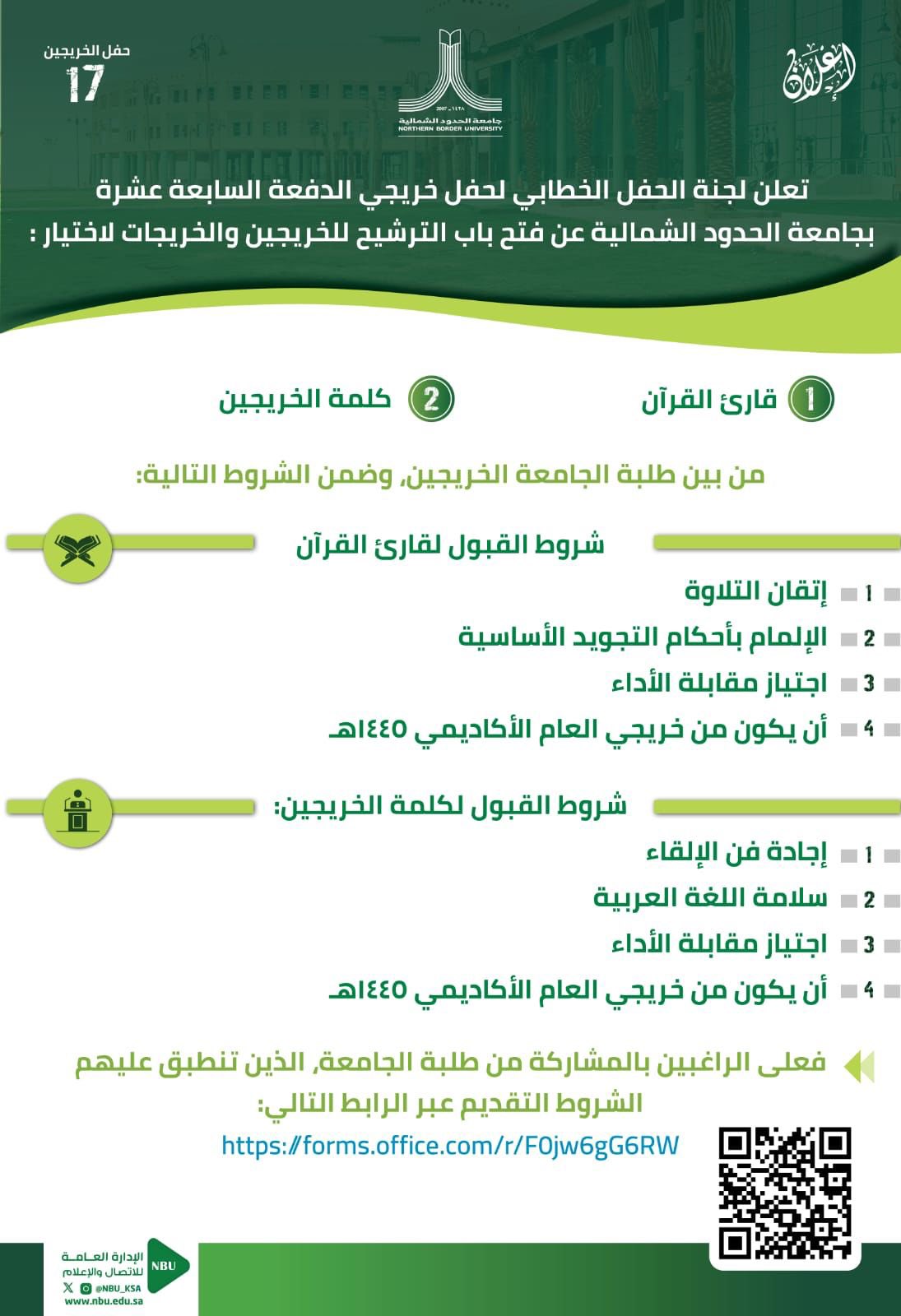 تعلن لجنة الحفل الخطابي عن إتاحة الفرصة لخريجي الجامعات وخريجاتها بالتقديم للمشاركة في تلاوة القرآن الكريم، وإلقاء كلمة الخريجين في حفل تخرج الدفعة 17، آخر موعد للتسجيل يوم الخميس الموافق 1445/10/16هـ، الساعة2:30م، على الرابط الآتي: