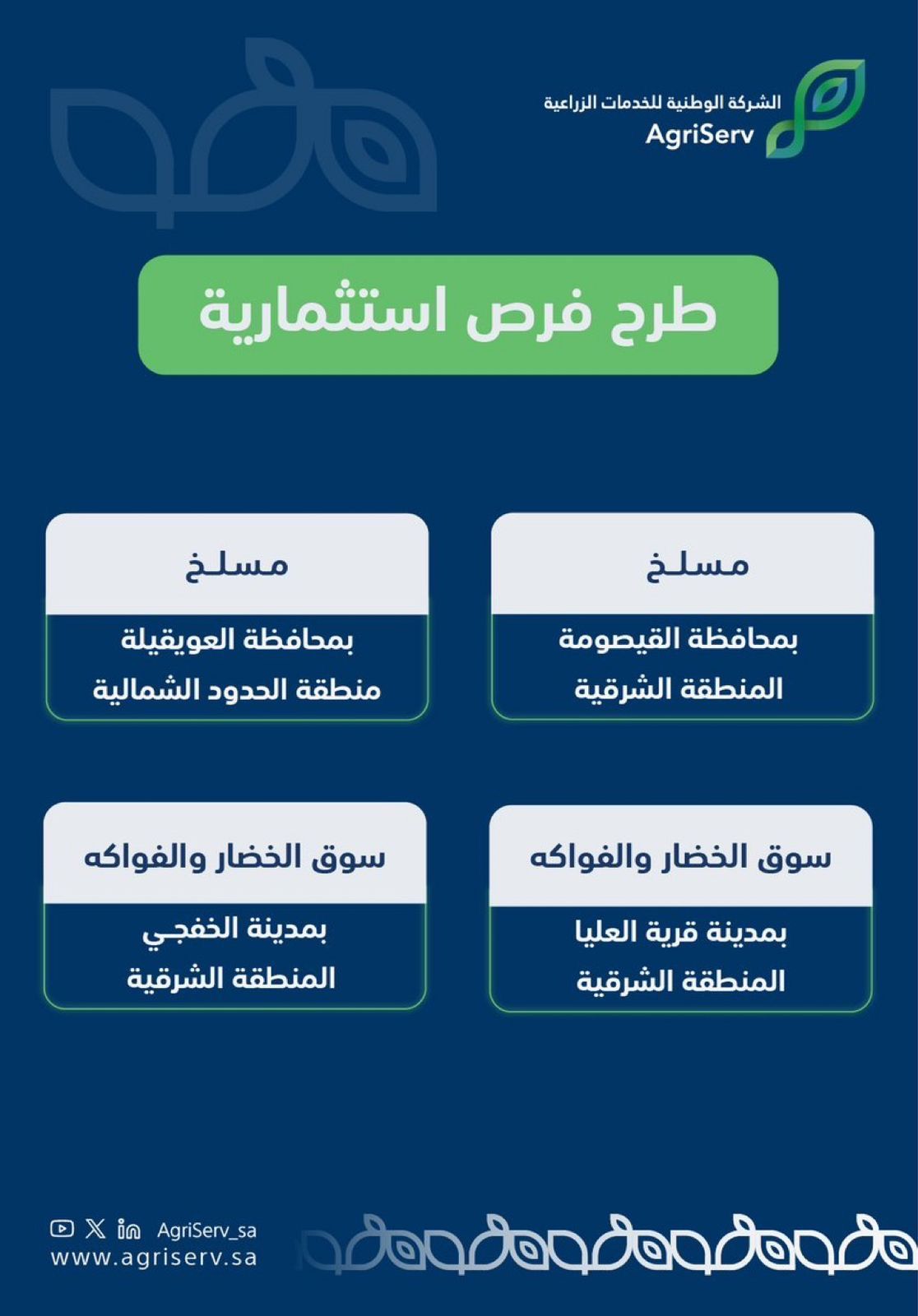 أعلنت الشركة الوطنية للخدمات الزراعية عن وجود عدد من الفرص الاستثمارية في اسواق النفع العام والمسالخ ومن مبينها مسلخ في محافظة العويقيلة للتقديم على الرابط :-
