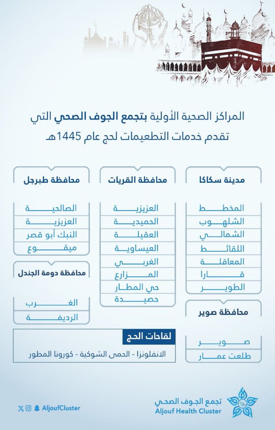 يُعلن تجمع الجوف الصحي عن مراكز الرعاية الصحية الأولية المتوفر لديها تطعيمات الحج لعام 1445هـ.