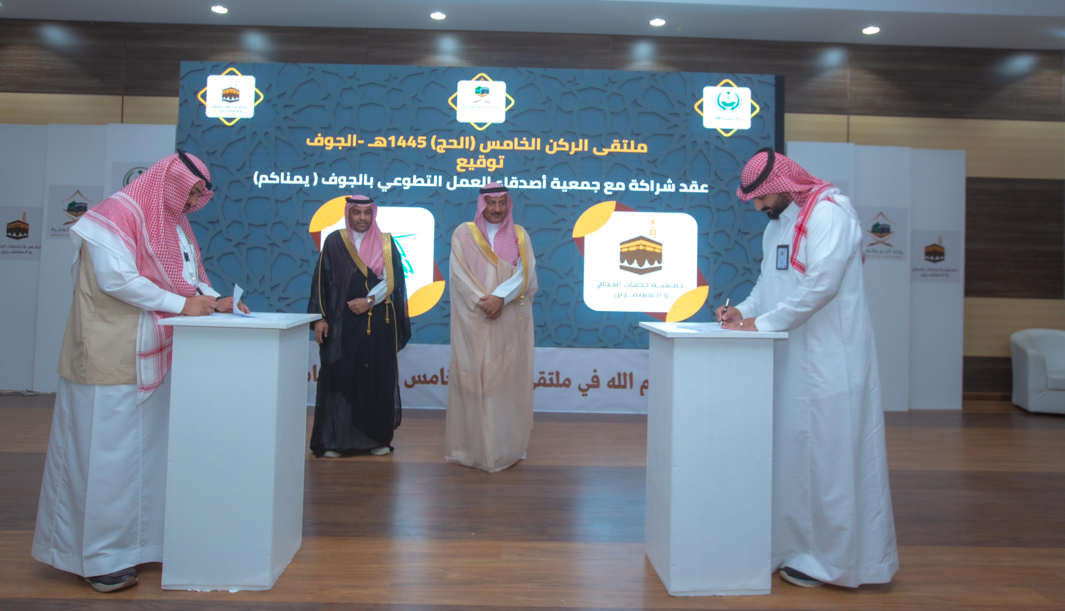 وبمباركة الدكتور طلال التمياط شهدت أعمال الملتقى توقيع اتفاقية تعاون وشراكة بين جمعية يمناكم للأعمال التطوعية وجمعية خدمات الححاج والمعتمرين بالجوف ،