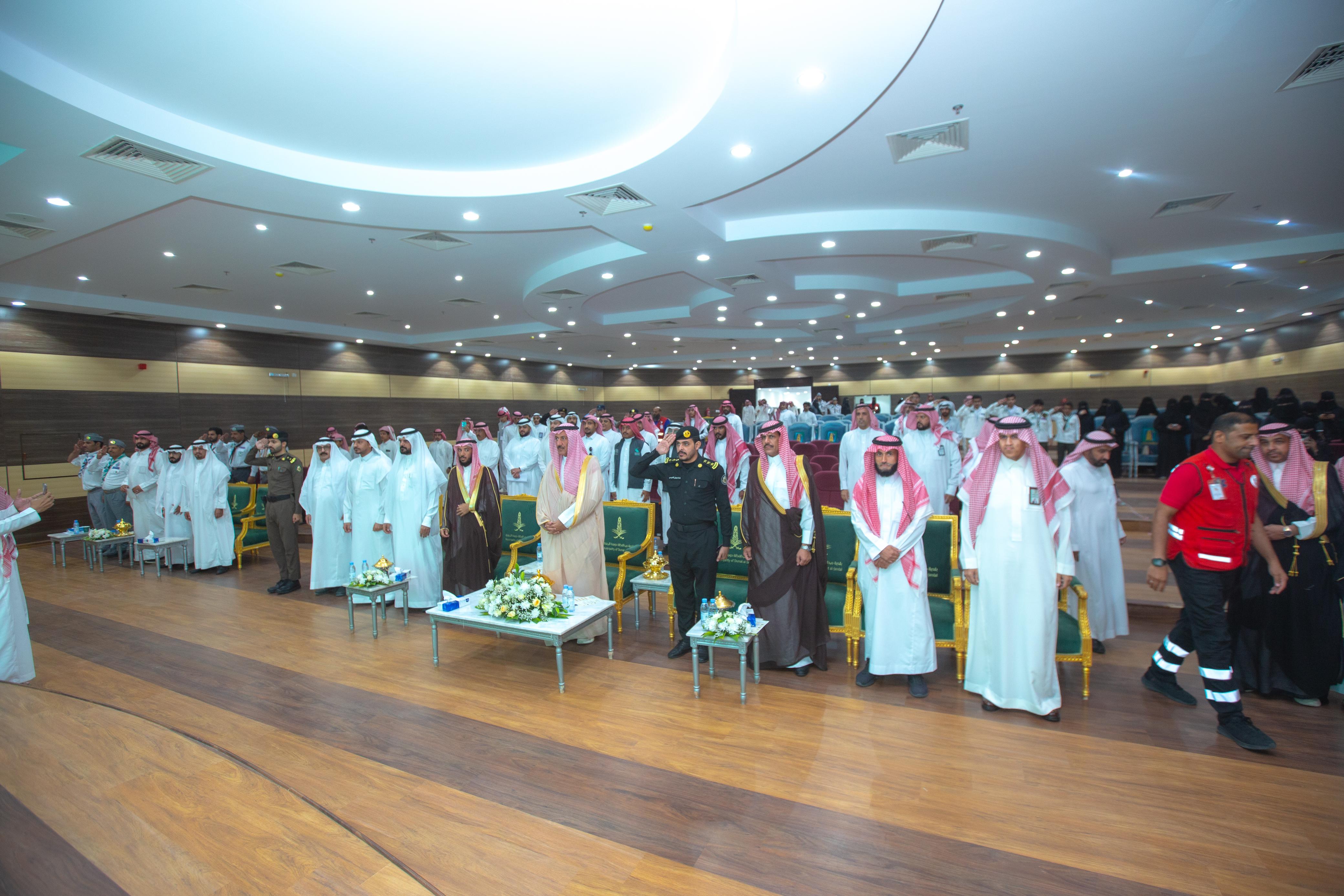 بحضور الدكتور طلال بن مشل التمياط وعقد الملتقى ليوم واحد وبدأت فعالياته بالسلام الملكي ، ثم استمع الحضور لآيات من القرآن الكريم ، بعدها تفضل رئيس مجلس الإدارة الأستاذ بدر الشمري بإلقاء كلمة رحب فيها بسعادة محافظ دومة الجندل وصحبه الكرام وبالمشاركين من كافة القطاعات الحكومية والأهلية ،معرباً عن شكره وأمتنانه لصاحب السمو الملكي الأمير فيصل بن نواف بن عبدالعزيز أمير منطقة الجوف وسمو نائبة على إقامه هذا الملتقى الذي تسعى الجمعية لتأهيل ابناء المنطقة للمشاركة بالأعمال التطوعية من خلال ماتقدمه من جلسات حواريه ودورات تدريبية في عدد من المجالات كالاسعافات الاولية وكيفية التعامل مع سائل السلامة ودراسة الخرائط الإرشادية ،