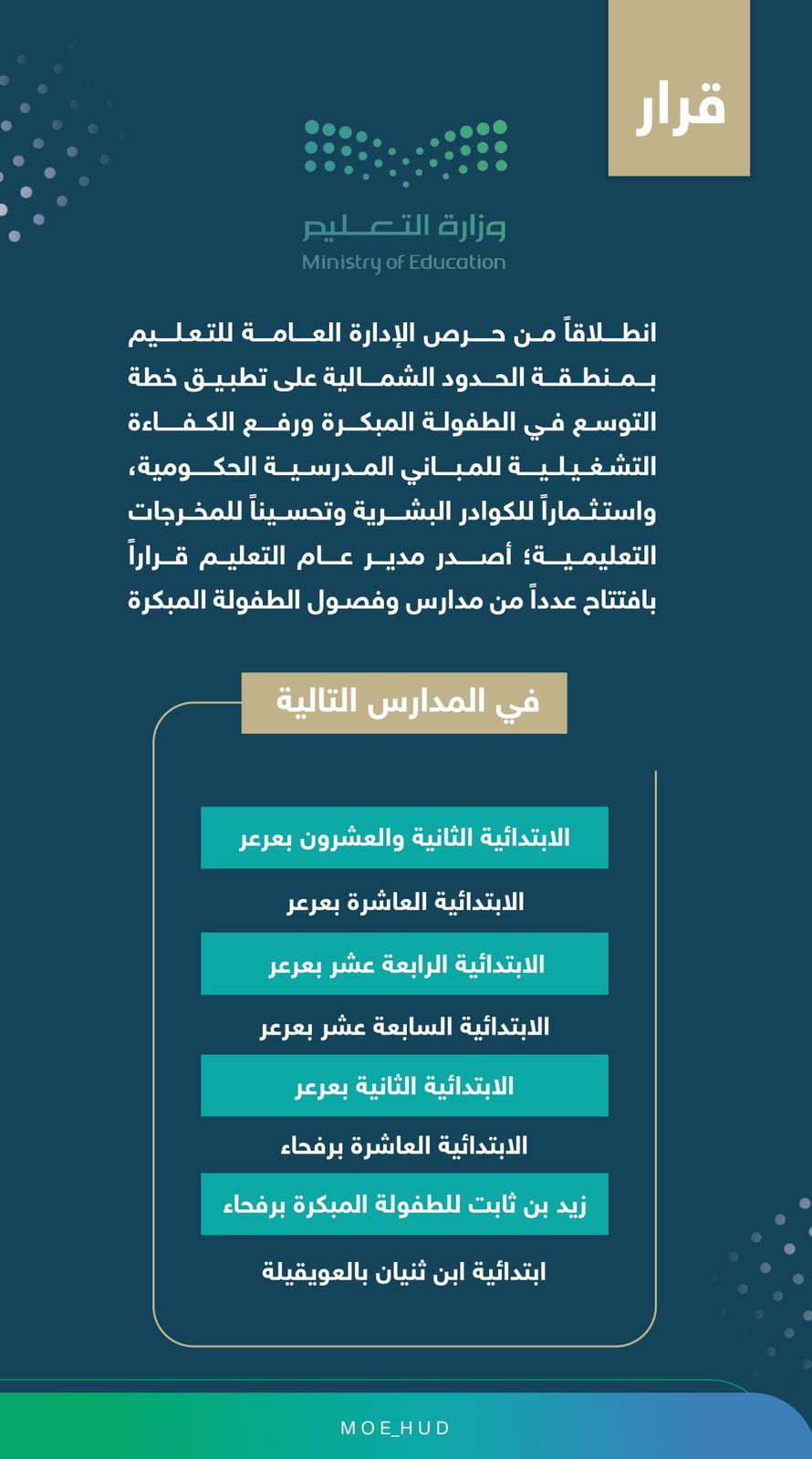 انطلاقاً من حرص الادارة العامة للتعليم بمنطقة الحدود الشمالية على تطبيق التوسع في الطفولة المبكرة ، ورفع الكفاءة التشغيلية للمباني المدرسية الحكومية ، واستثماراً للكوادر البشرية وتحسيناً للمخرجات التعليمية ، اصدر مدير عام التعليم قرارا بإفتتاح عدد من مدارس وفصول الطفولة المبكرة ومن ضمن هذا المدارس ابتدائية ابن ثنيان بالعويقيلة