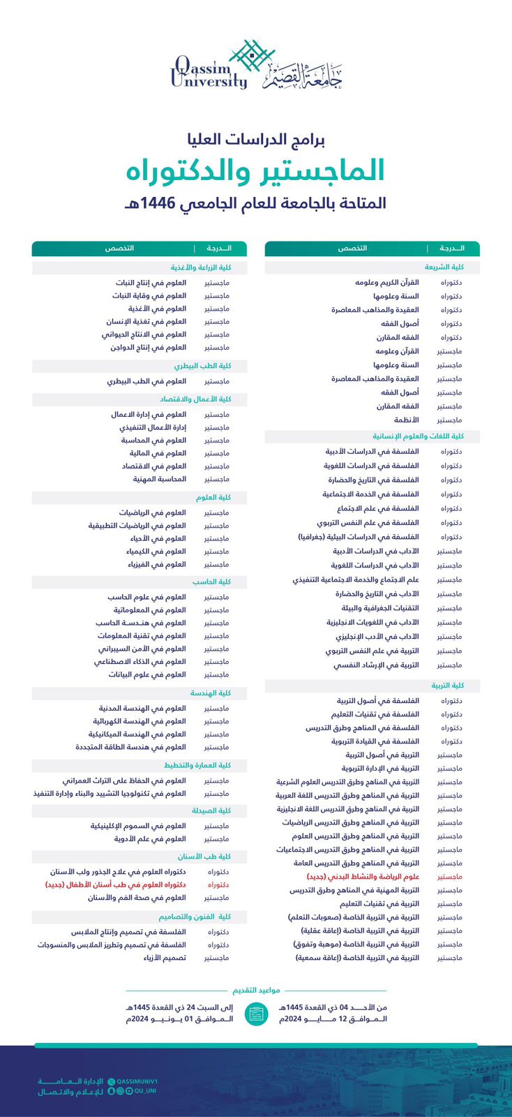 أعلنت جامعة القصيم، ممثلة بعمادة الدراسات العليا والبحث العلمي، عن موعد بدء التقديم على برامج الدراسات العليا "ماجستير ودكتوراه" للعام الجامعي المقبل 1446هـ، وذلك اعتبارًا من اليوم الأحد حتى تاريخ 1445/11/24هـ ،حيث تستقبل العمادة طلبات الراغبين في التقديم على هذه البرامج إلكترونيًا عبر البوابة الإلكترونية للجامعة.