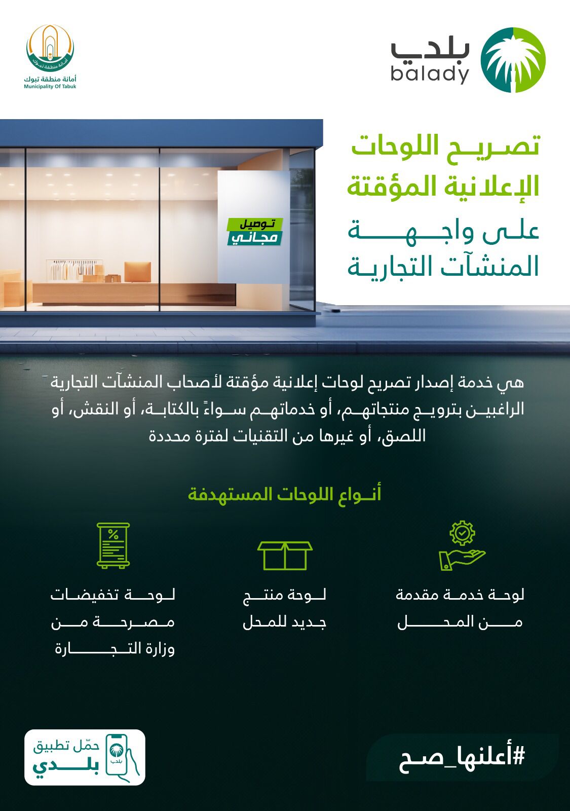 ضمن جهودها لتعزيز جودة الخدمات المقدمة للعملاء، وتنظيم اللوحات الإعلانية المؤقتة على واجهات المنشآت التجارية؛ أطلقت أمانة تبوك خدمة تصريح اللوحات الإعلانية المؤقتة عبر تطبيق بلدي، بهدف رفع معيار الامتثال للمظاهر البصرية في المدن والمناطق، وتنسيق إعلانات التخفيضات للمنشآت التجارية بالتعاون مع وزارة التجارة.