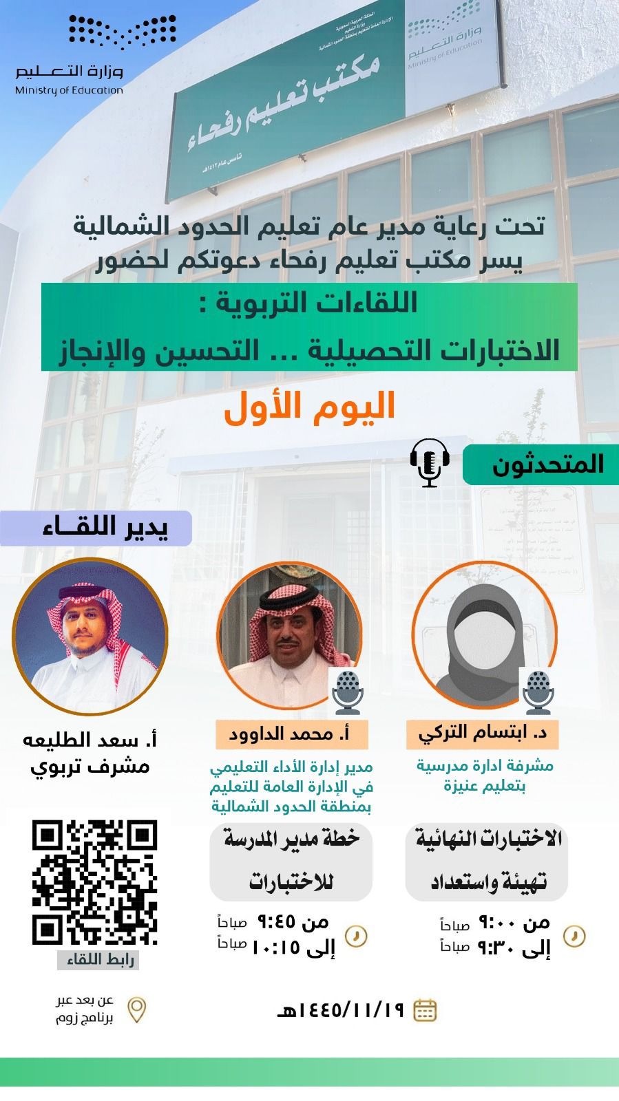 انطلق اليوم الاثنين برنامج اللقاءات التربوية والذي تنظمه الإدارة العامة للتعليم بمنطقة الحدود الشمالية ممثلة بمكتب تعليم رفحاء والذي يستمر لمدة ثلاثة أيام تحت بعنوان :