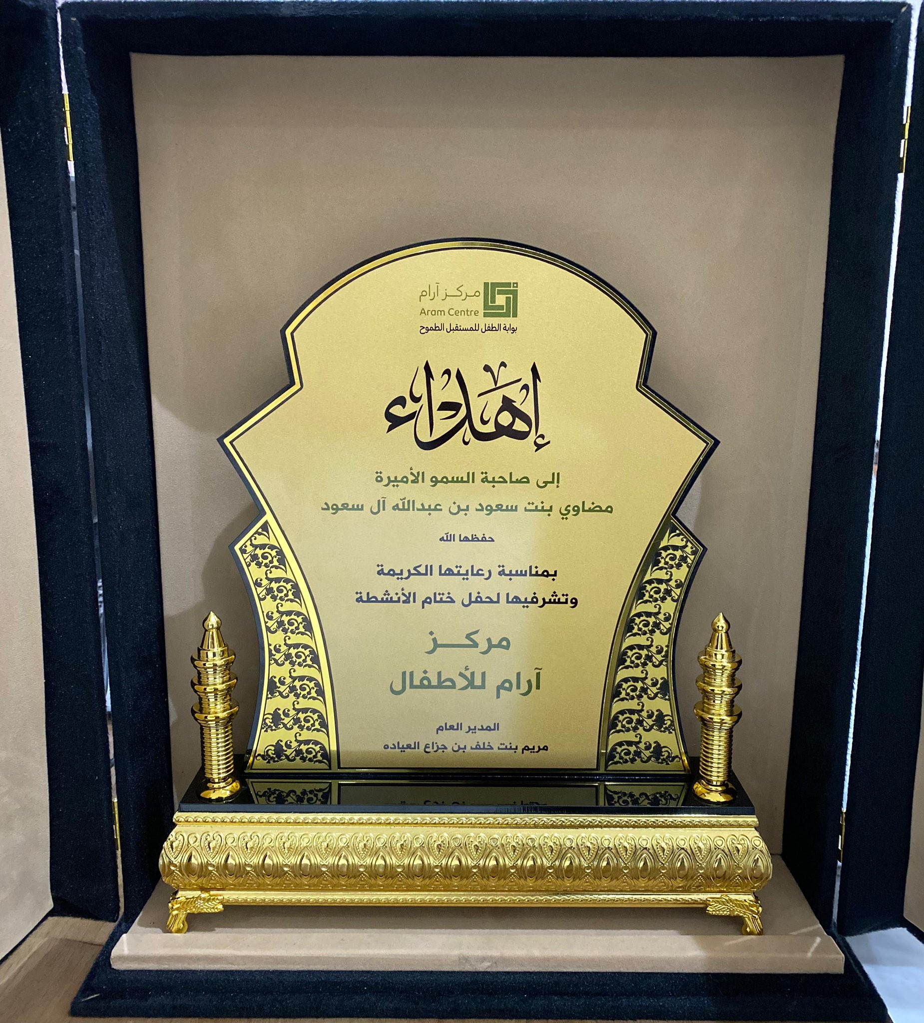 وتمنت سموها لطلاب وطالبات مركز آرام مزيداً من الإبداع والنجاح، وسائلة المولى أن يديم على هذه البلاد نعمة الأمن والأمان والنماء الدائم، ثم استلمت سموها درعاً تذكارياً بهذه المناسبة.