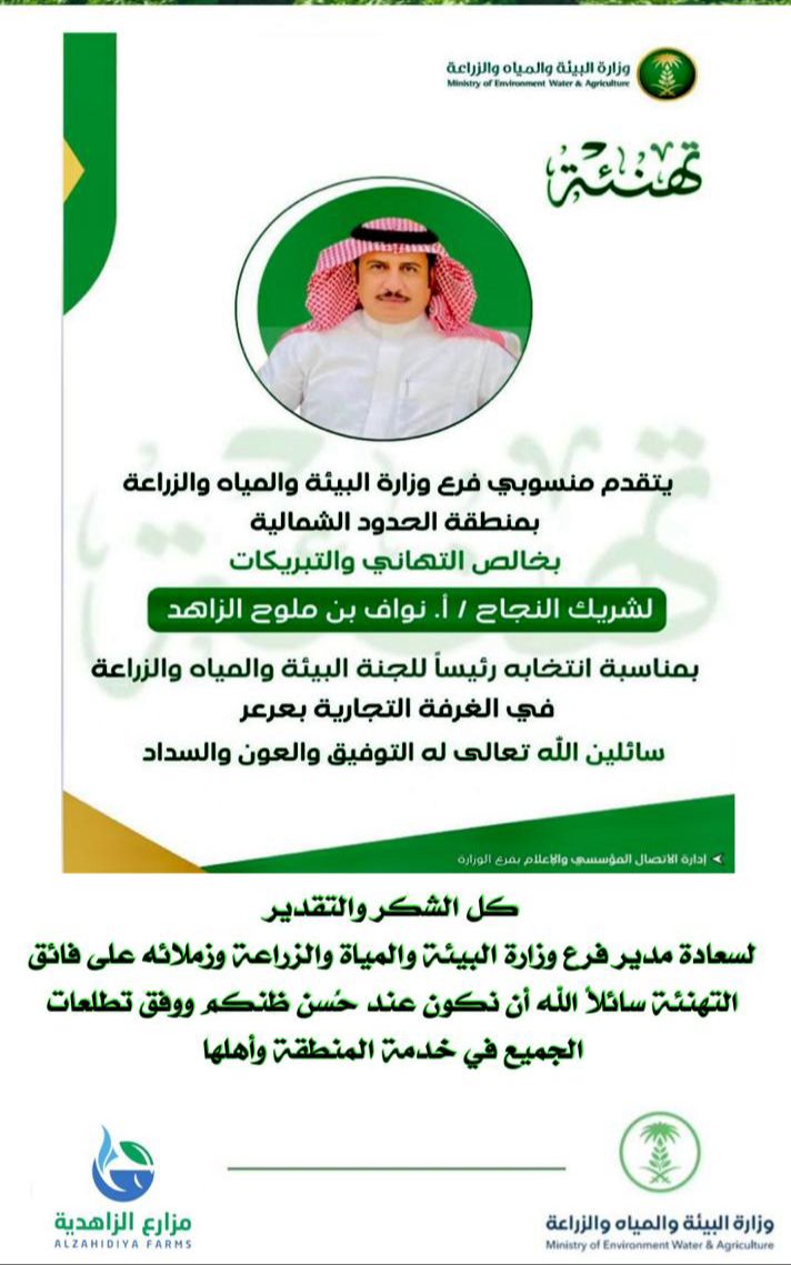 هَنَّأَ مدير عام فرع وزارة البيئة والمياه والزراعة بالحدود الشمالية أ-م/بندر صالح الهدية شريك النجاح رجل الاعمال الاستاذ نواف بن ملوح الشمري بمناسبة انتخابه رئيساً للجنة البيئة والمياه والزراعة في الغرفة التجارية بعرعر .