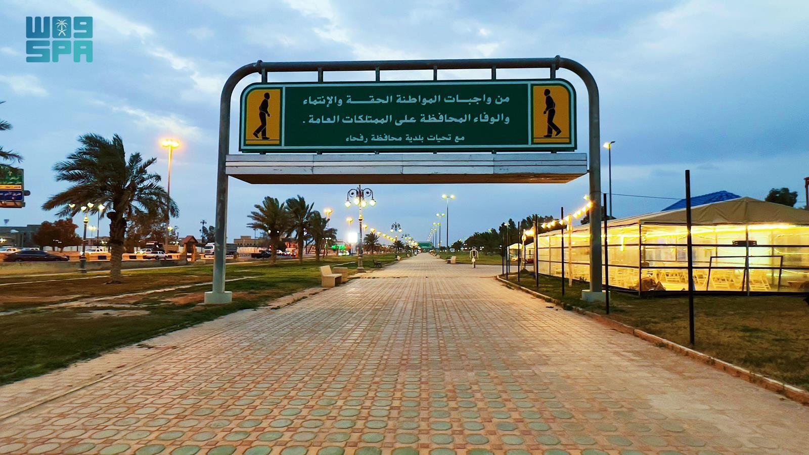 تشهد الحدائق والمتنزهات ومضامير المشاة بمحافظة رفحاء بمنطقة الحدود الشمالية في فترة المساء هذه الأيام إقبالاً كبيراً من الأهالي، لقضاء وقت الراحة فيها ؛كما تم تخصيص العديد من الممرات في الحدائق لكي يستطيع الأشخاص التنزه وممارسة رياضة المشي، وزودت الحدائق بألعاب منوعة تناسب جميع الأعمار،ووجود مطاعم الفود ترك والخدمات الأخرى.