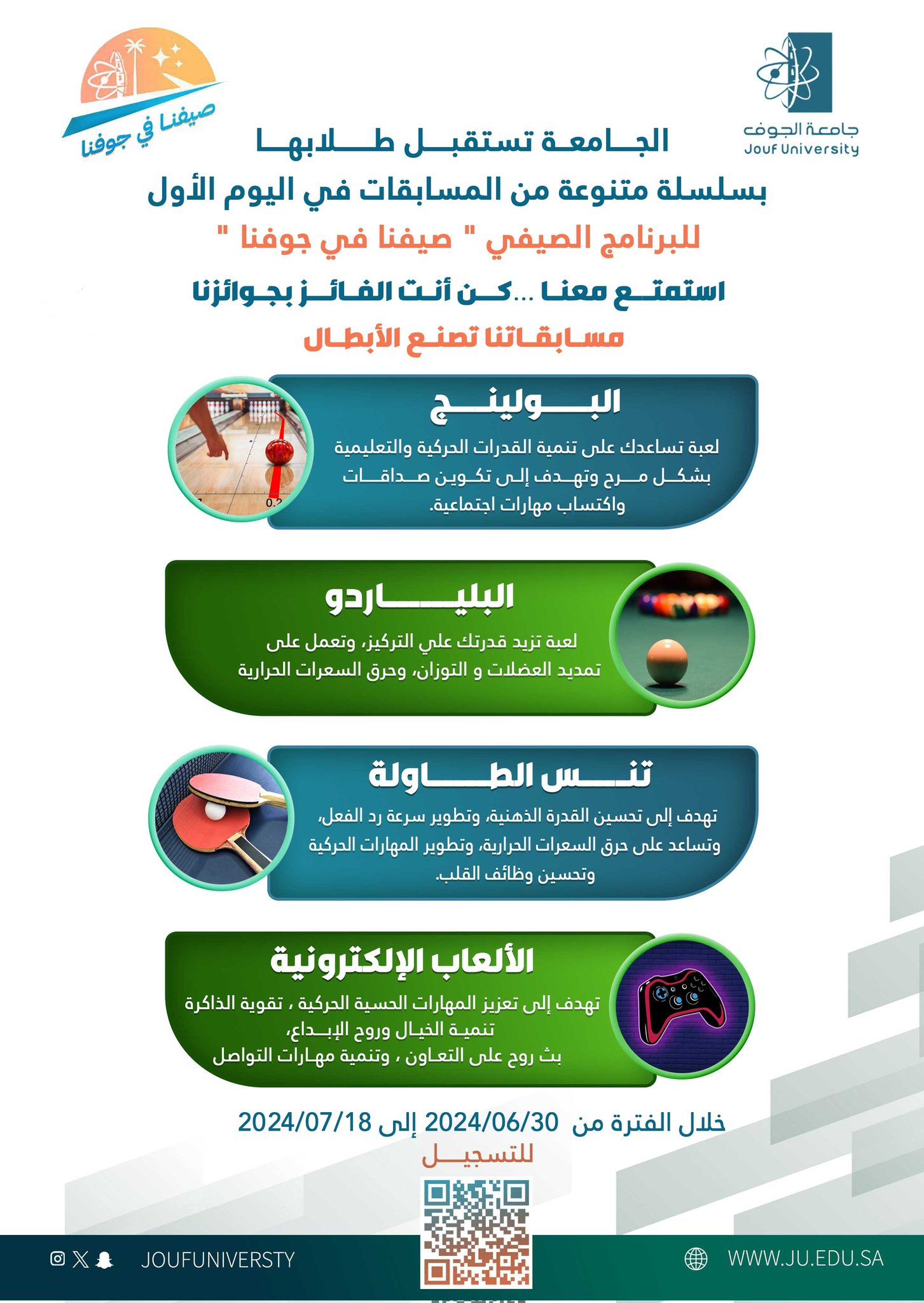برعاية سعادة رئيس جامعة الجوف، أ.د. محمد بن عبدالله الشايع، تنطلق غدًا -بمشيئة الله- مسابقات اليوم الأول، لفعاليات البرنامج الصيفي "صيفنا في جوفنا" والذي يستهدف طلاب، وطالبات الجامعة.