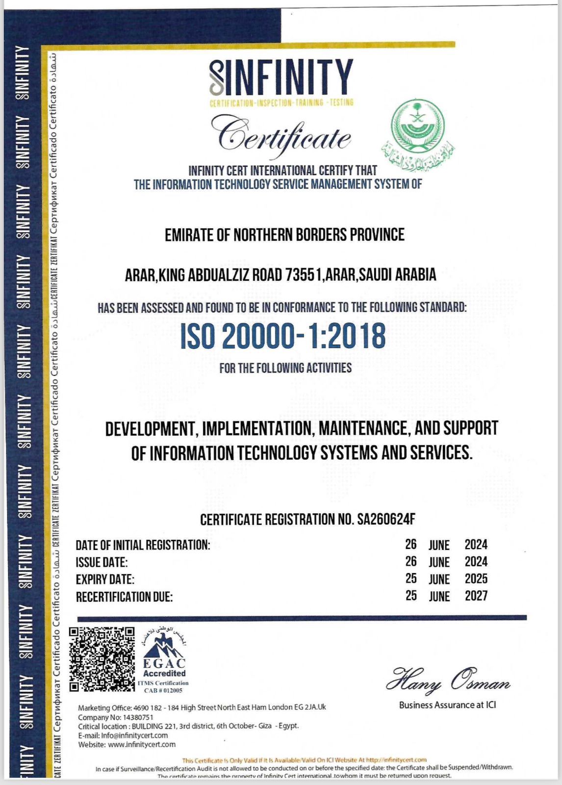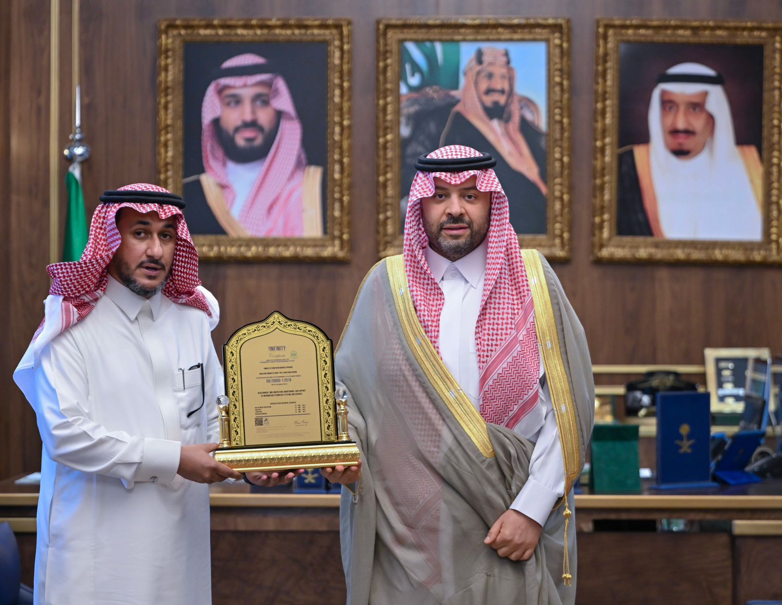 بارك صاحب السمو الملكي الأمير فيصل بن خالد بن سلطان بن عبد العزيز أمير منطقة الحدود الشمالية، حصول إمارة المنطقة على شهادة الجودة في نظام إدارة خدمات تقنية المعلومات (ISO 20000)، وذلك لتحقيقها الكفاءة العالية في الخدمات التقنية والالتزام بتقديم أفضل الممارسات التي تسهم في تطوير منظومة التقنية وفقًا للمواصفات العالمية.