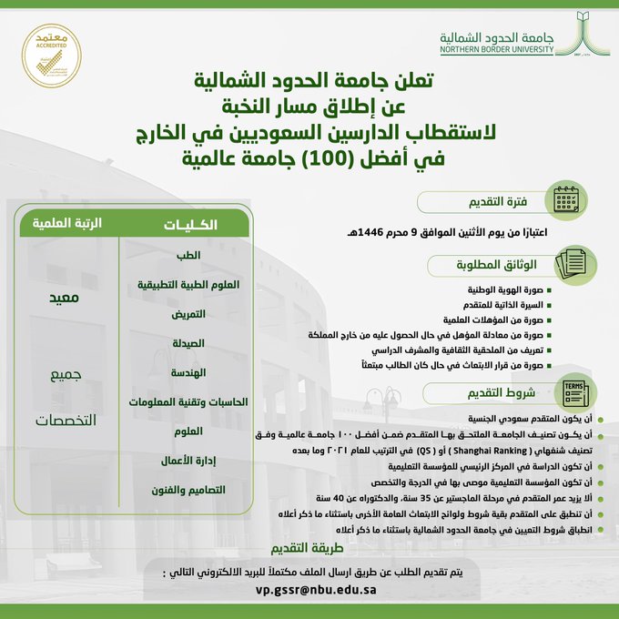 أعلنت جامعة الحدود الشمالية عن إطلاق مسار النخبة لاستقطاب الدارسين السعوديين في الخارج في أفضل (100) جامعة عالمية.