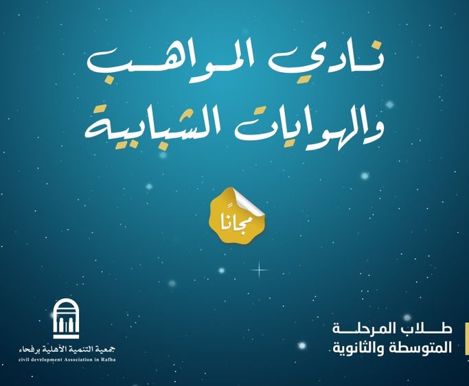 انطلقت أمس، فعاليات برنامج نادي المواهب والهوايات الشبابية الذي تقيمه جمعية التنمية الاجتماعية الأهلية بمحافظة رفحاء، لطلاب المرحلة المتوسطة والثانوية، وذلك بصالات وملاعب مدرسة عبادة بن الصامت المتوسطة.