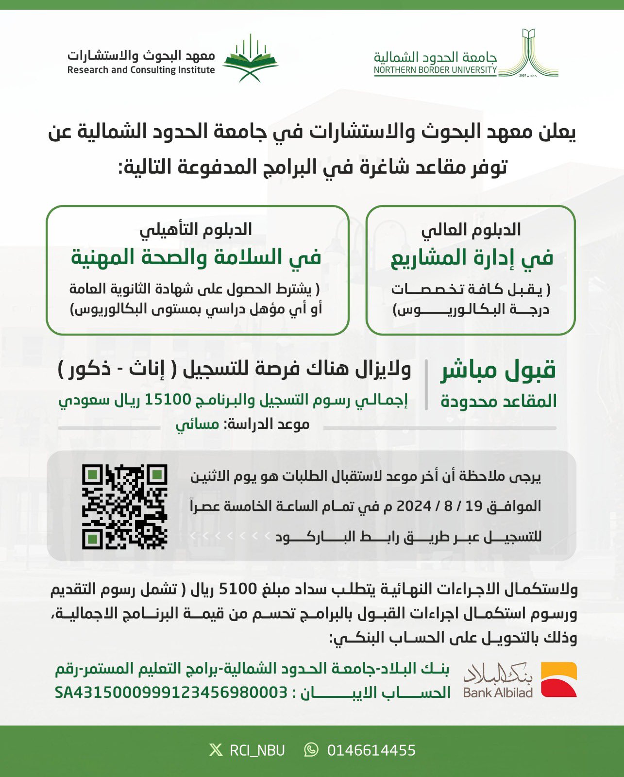 يسر معهد البحوث والاستشارات في جامعة الحدود الشمالية أن يعلن عن توفر مقاعد شاغرة بقبول مباشر في البرامج( المدفوعة) التالية: