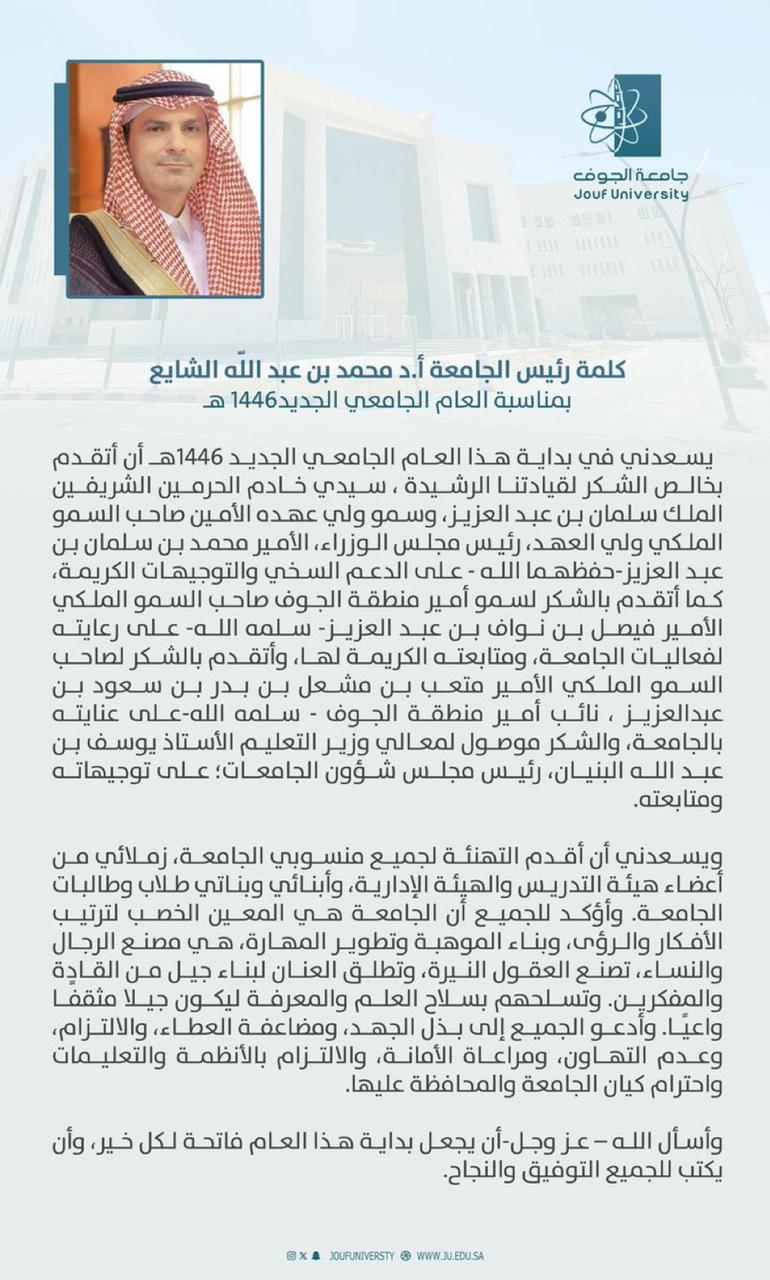 رئيس جامعة الجوف الأستاذ الدكتور محمد بن عبد الله الشايع يوجه كلمة لأبنائه طلاب وطالبات الجامعة ومنسوبيها بمناسبة بداية الدراسة للعام الجامعي 1446هـ