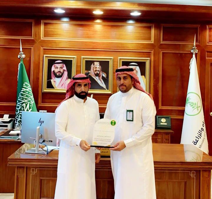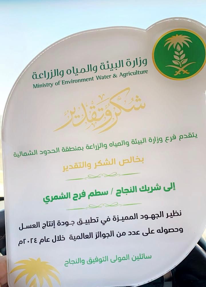 كرم مدير فرع وزارة البيئة والمياه والزراعه بمنطقة الحدود الشمالية المهندس بندر الهدية الاستاذ سطم بن فرح الشمري صاحب مناحل الحسام للعسل البري وجاء هذا التكريم بمناسبة فوز عسل سدر الشمال البري بذهبية باريس الدولية 2024 في فرنسا .