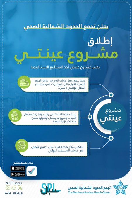 يُعـلنْ تجمع الحدود الشمالية الصحي إطــلاقْ "مشــروع عـينتي " أحد المشاريع الإستراتيجية والذي يعمل على نقل عينات الدم من مراكز الرعاية الصحية الأولية الى المختبرات المرجعية عبر الناقل الوطني ( سُبل ) .