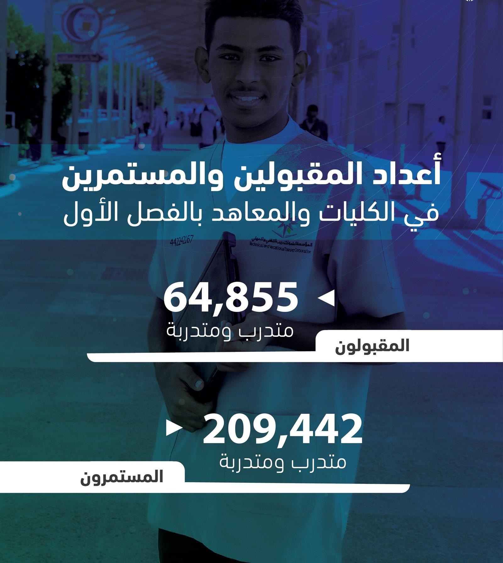 أعلنت المؤسسة العامة للتدريب التقني والمهني، أن عدد المقبولين في الكليات التقنية والمعاهد الصناعية والعمارة والتشييد الثانوية بالفصل الأول من العام الجاري بلغ (64.855) متدربًا ومتدربة.
