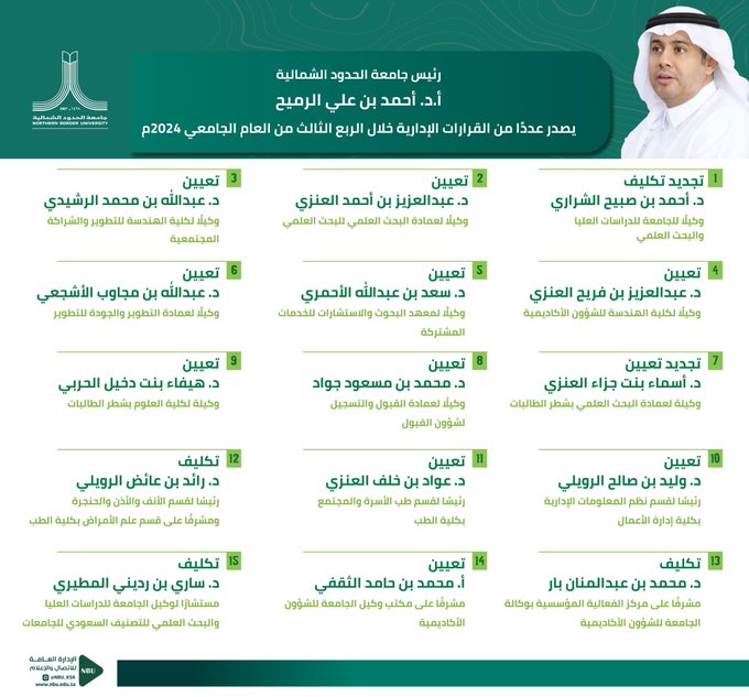 أصدر رئيس جامعة الحدود الشمالية أ.د. أحمد بن علي الرميح؛ عددًا من القرارات الإدارية خلال الربع الثالث من العام الجامعي 2024م.
