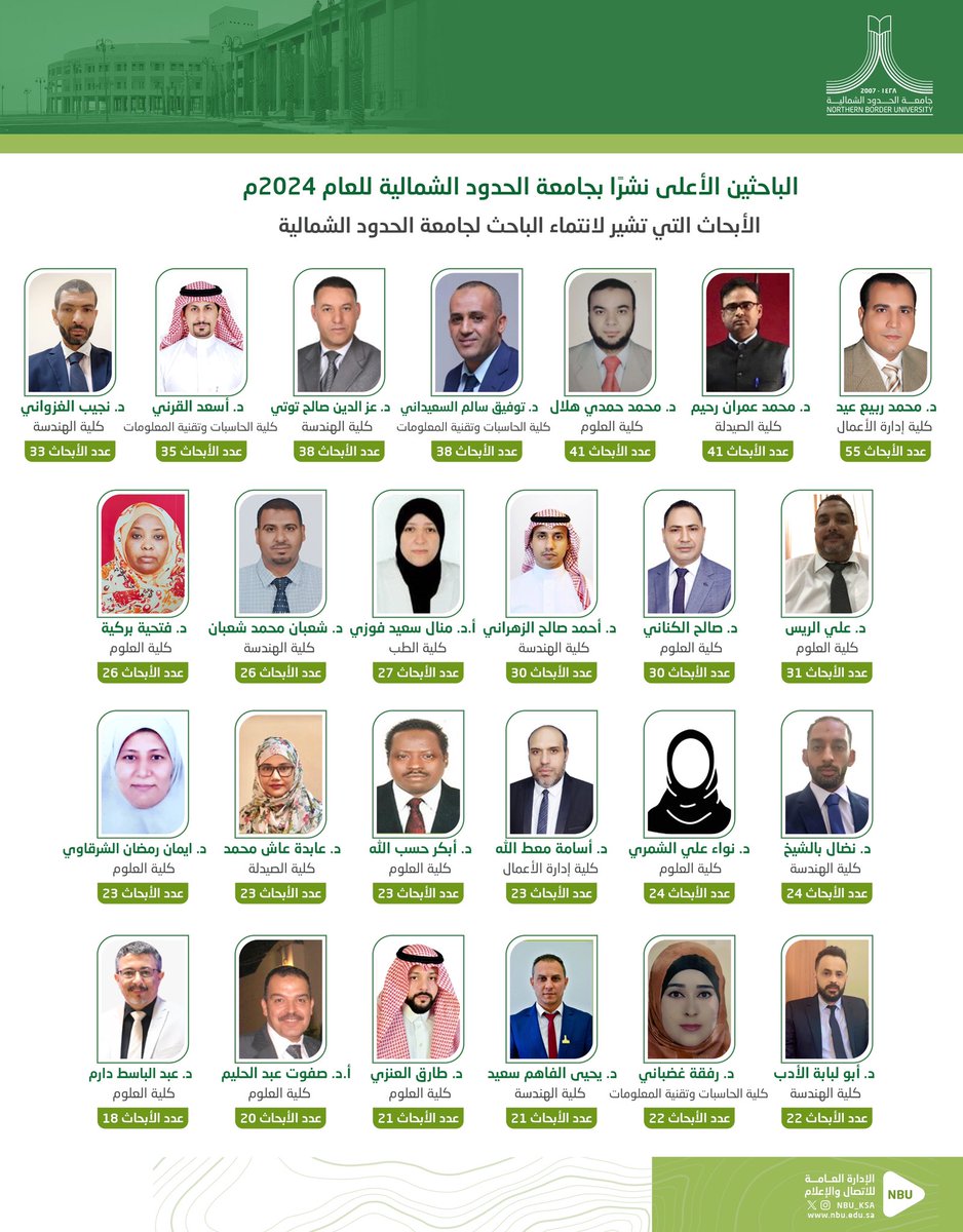 أعلنت جامعة الحدود الشمالية أسماء الباحثين الأعلى نشرًا بالجامعة للعام 2024م، والتي تشير أبحاثهم لانتماء الباحث للجامعة، وفق قواعد بيانات شبكة العلوم وسكوبس.