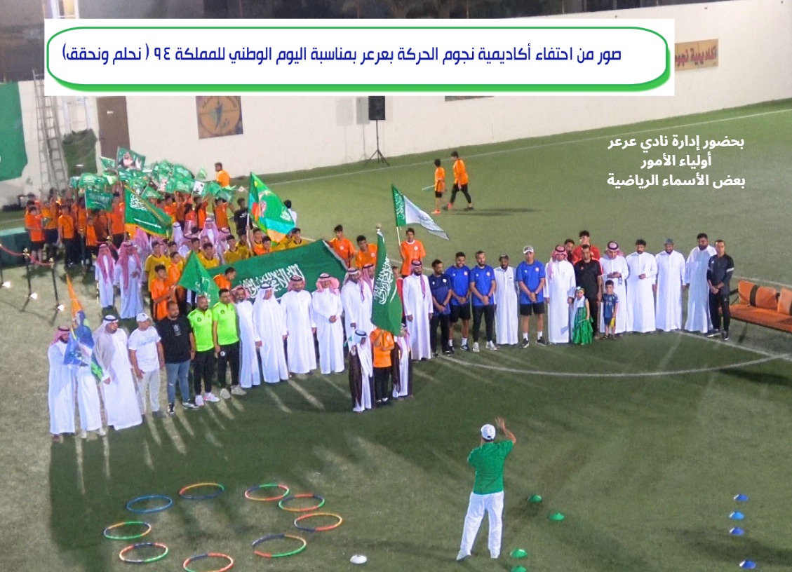 احتفت إدارة أكاديمية نجوم الحركة الرياضية بعرعر باليوم الوطني للمملكة 94 ( نحلم ونحقق) ، بحضور عدد من أعضاء الجهاز الإداري والفني بنادي عرعر وأولياء الأمور وبعض الأسماء الرياضية ، اشتمل الحفل على النشيد الوطني وحركة ( التيفو) الرياضية ومسيرة رافعة العلم للحضور داخل مضمار الأكاديمية ، كما أدى العرضة النجدية وفد جمعية براعم لتنمية الطفل ومنسوبي الأكاديمية ، وأقيمت مسابقات حركية وقدمت لهم الجوائز ، وتم تكريم الرئيس التنفيذي بنادي عرعر الدكتور أنور السموحي ورئيس جمعية براعم لتنمية الطفل حمود جحفل العنزي والإعلامي عبد العزيز السلطاني ، واختتم الحفل بالتقاط صور تذكارية