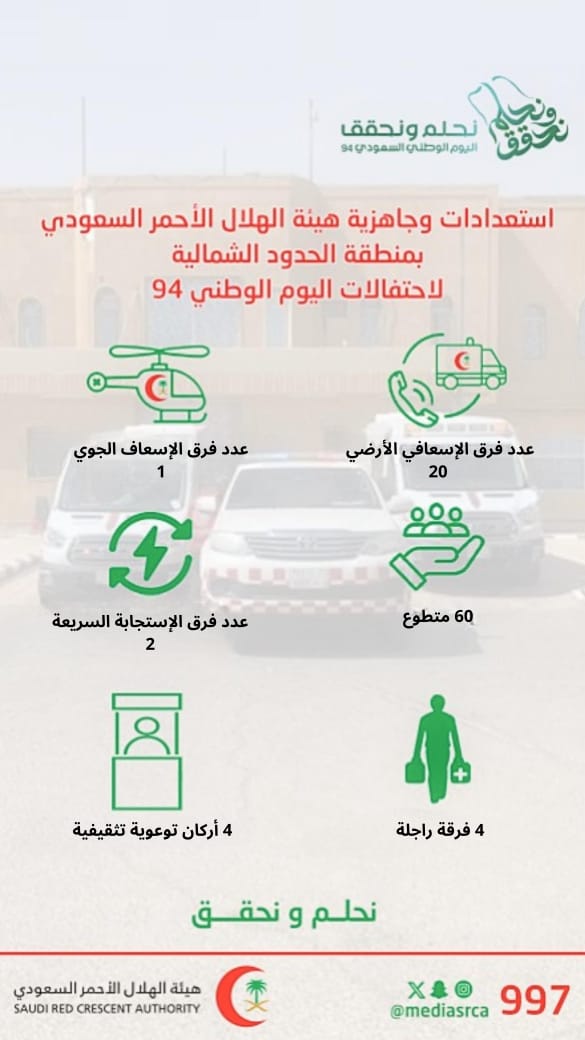 وقال مدير عام فرع هيئة الهلال الأحمر السعودي بمنطقة بالمنطقة الأستاذ /مساعد غالي العنزي بأن الهيئة بالمنطقة، استعدت بعدد (20) فرقة إسعافيه مجهزة وعلى مدار الساعة و فرقة أستجابة سريعة وأكثر من (4) فرق طبية راجلة موزعة على الأماكن التي تشهد كثافة من المحتفلين بالمنطقة