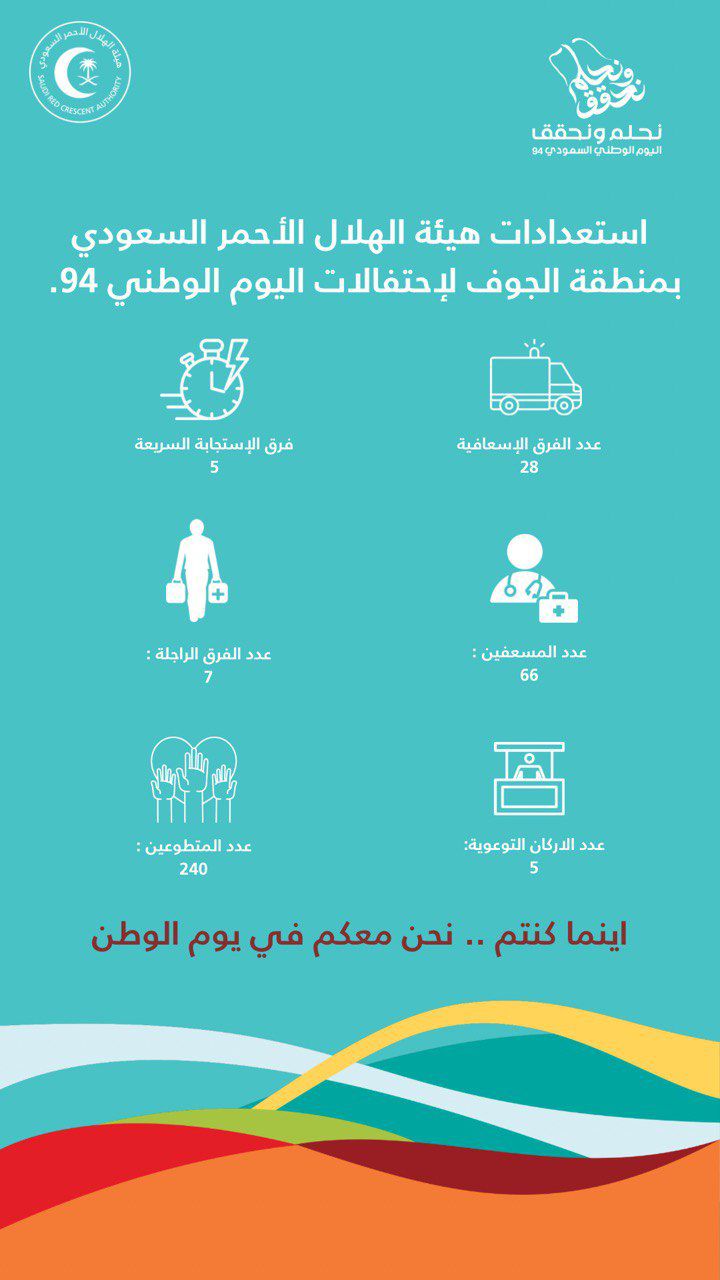 استمرّت هيئة الهلال الأحمر السعودي بمنطقة الجوف في رفع جاهزيتها للاحتفال باليوم الوطني الـ94، حيث شملت الاستعدادات جميع المراكز الإسعافية ومواقع الاحتفالات، وذلك
